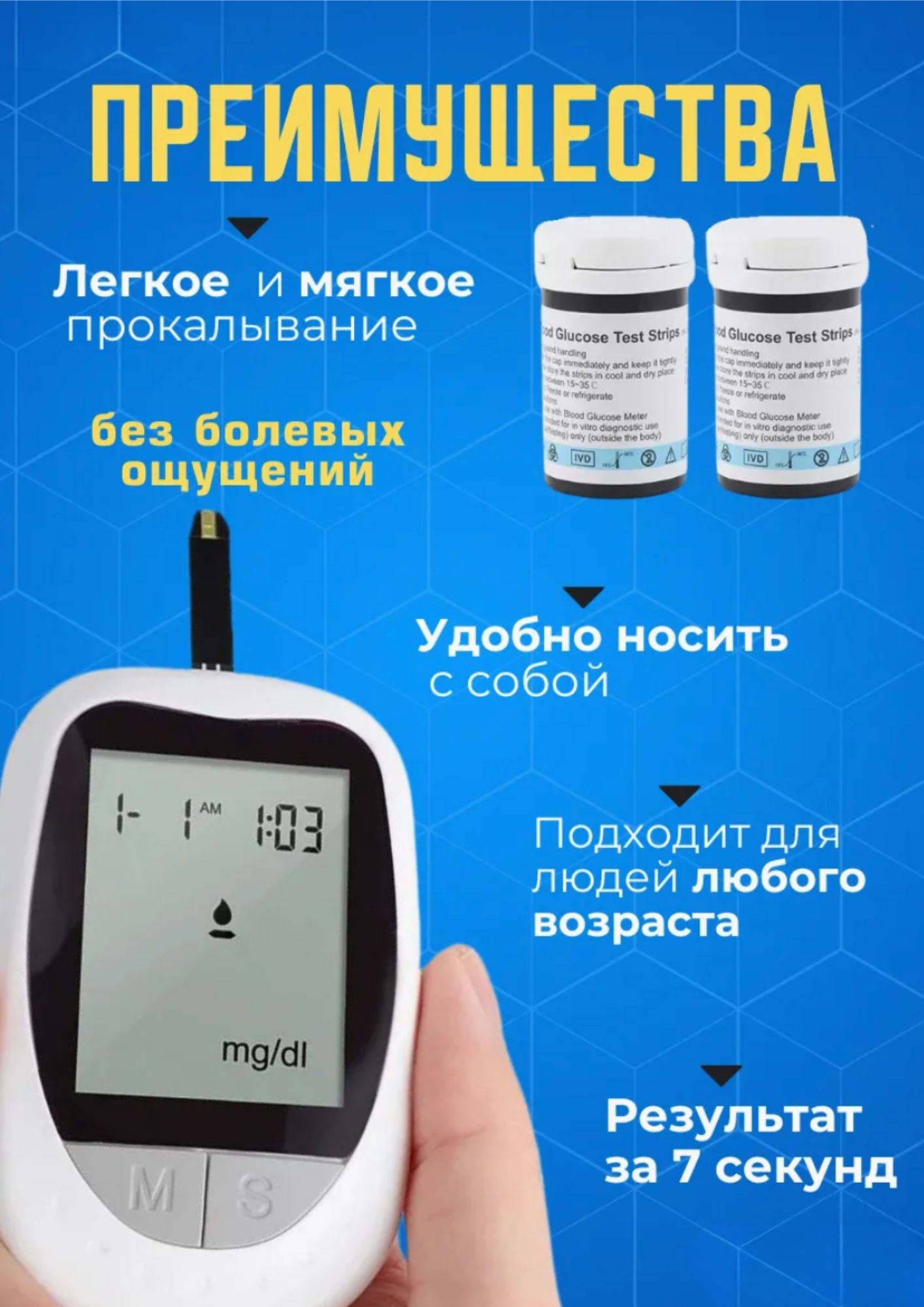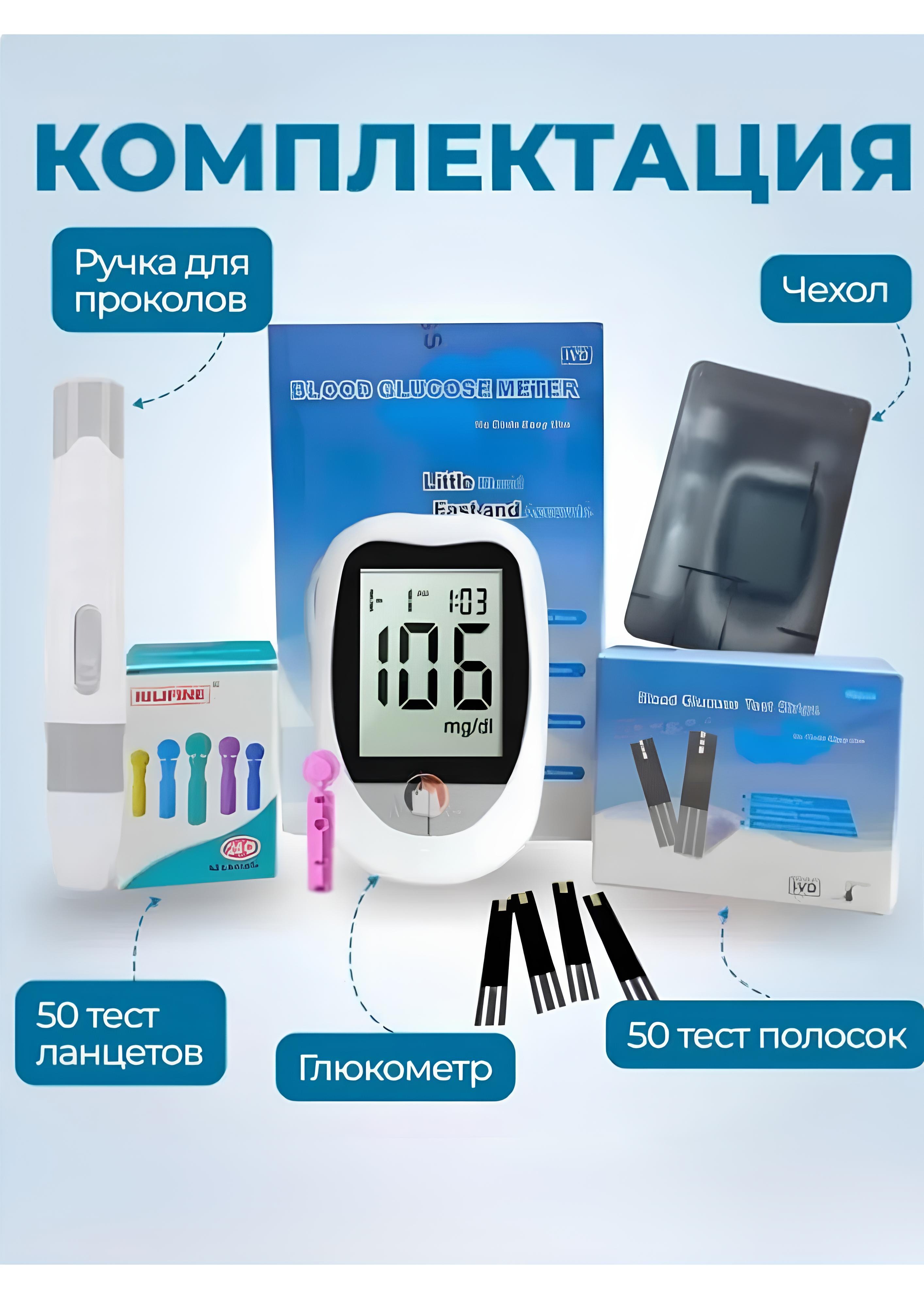 Глюкометр (в комплекте ланцеты и тест полоски, 50шт)