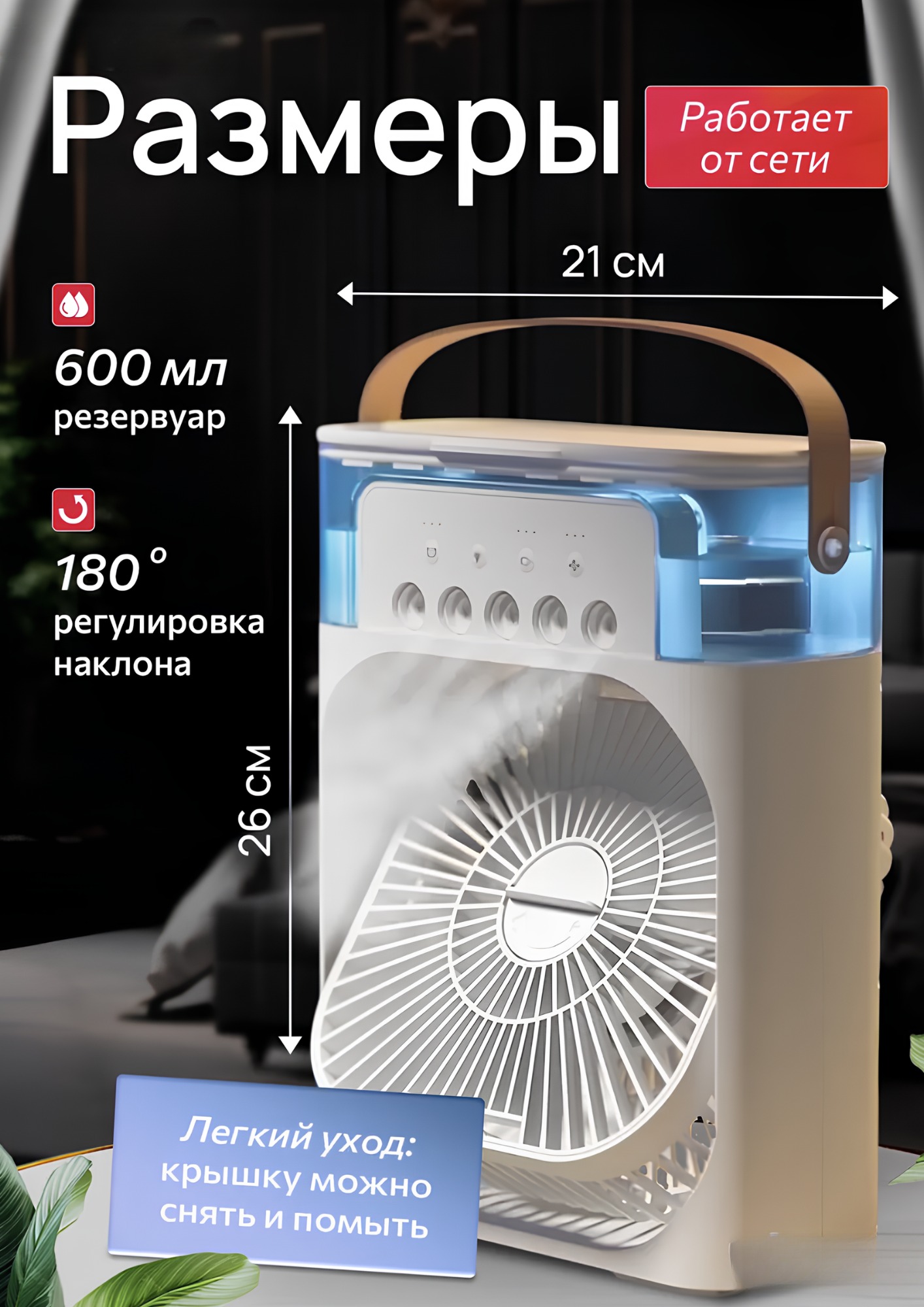 Портативный мини кондиционер 3в1: вентилятор, увлажнитель и охладитель воздуха с LED-подсветкой (26×20×9 см)