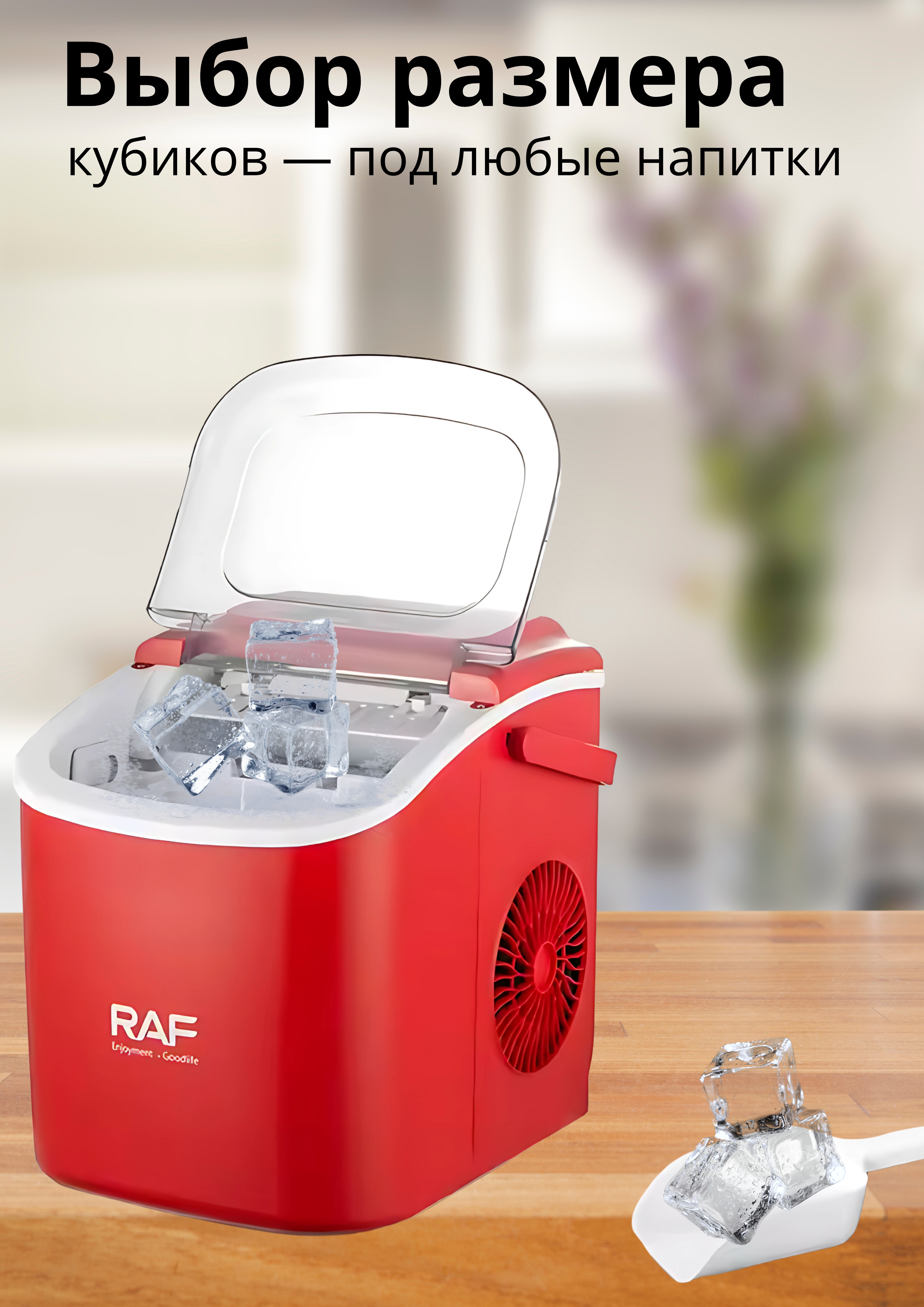Прибор производит до 12 кг льда в сутки, а одна партия готова всего за 6–13 минут. Вы можете выбрать размер кубиков льда в зависимости от напитков или блюд. Прозрачная крышка позволяет наблюдать за процессом, а функция автоматической очистки делает уход простым и удобным.