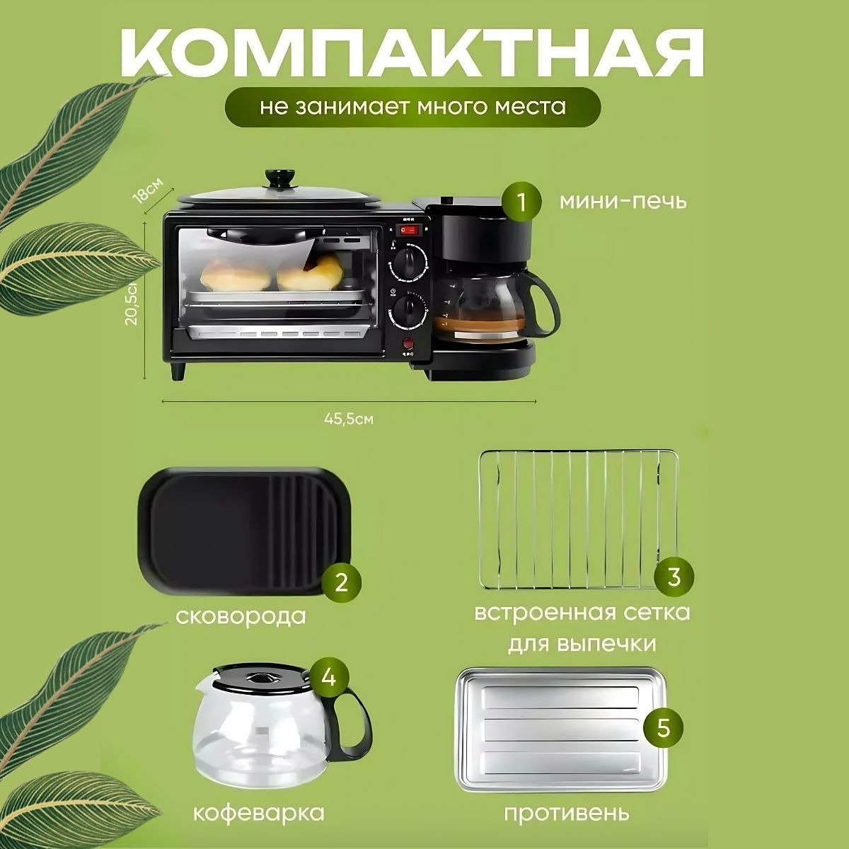 Многофункциональная электрическая духовка 3 в 1 — это компактный и удобный прибор для приготовления вкусных завтраков и разнообразных блюд. Она сочетает в себе три полезные функции: духовку, кофеварку и сковороду с крышкой. Один прибор заменяет сразу несколько кухонных устройств, экономит место и время.