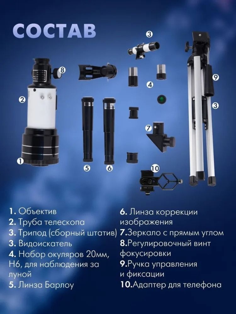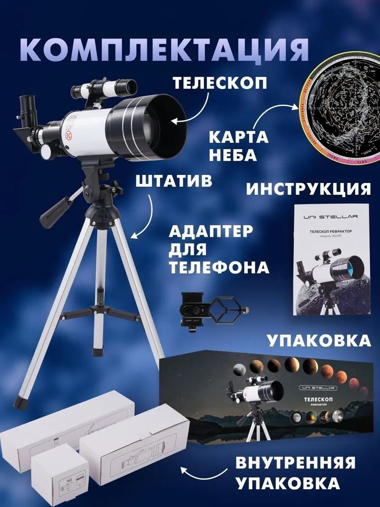 Телескоп оснащен прочным алюминиевым штативом, который обеспечивает устойчивость и точность при фокусировке. Оптическая система рефракционного типа и многослойные стеклянные линзы позволяют получать яркие и детализированные изображения.