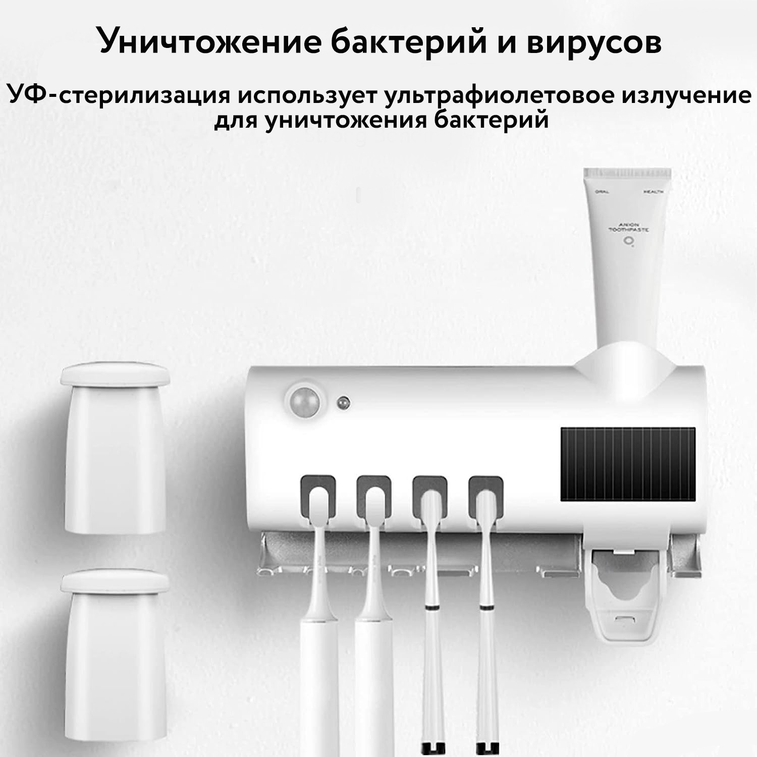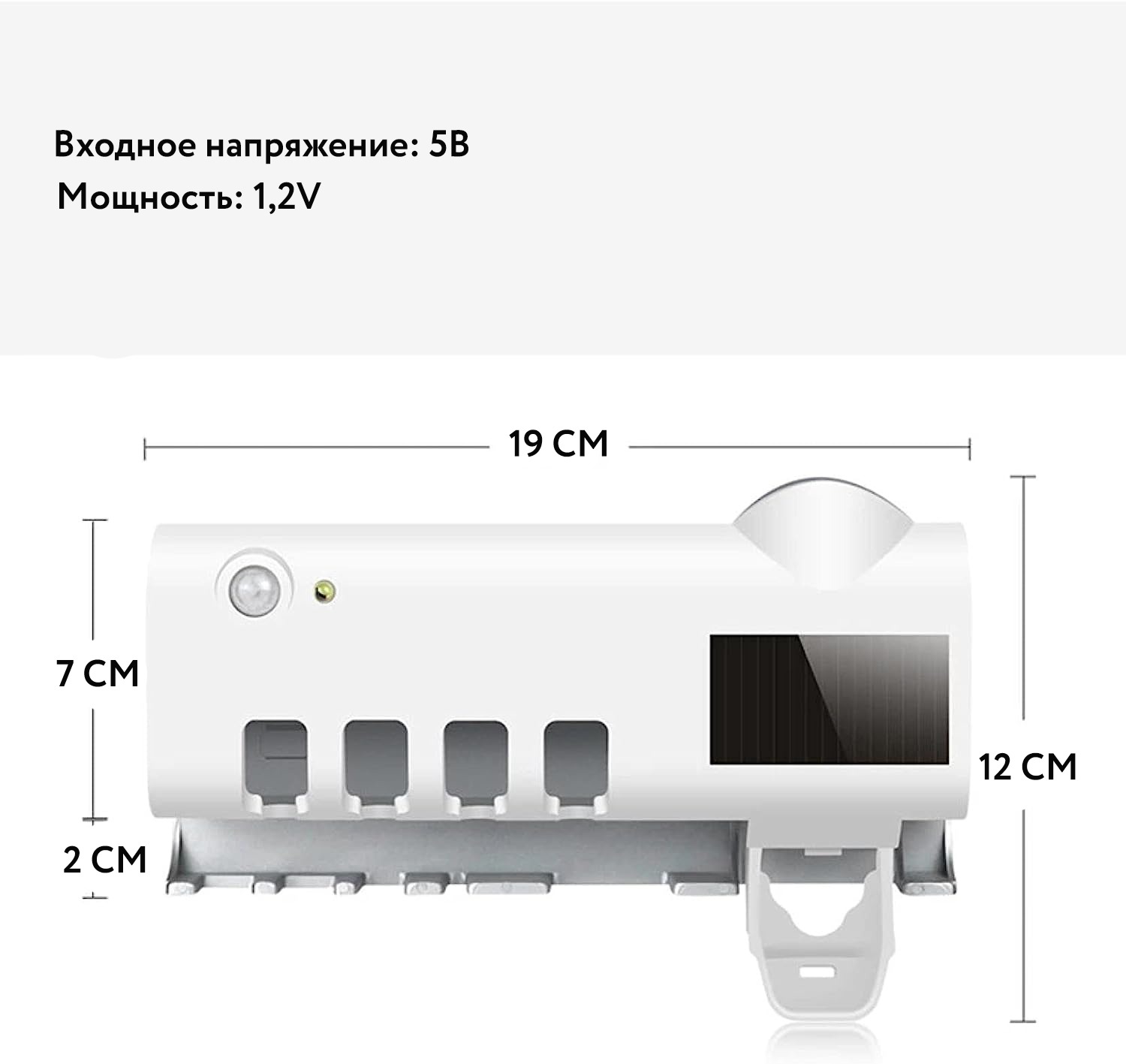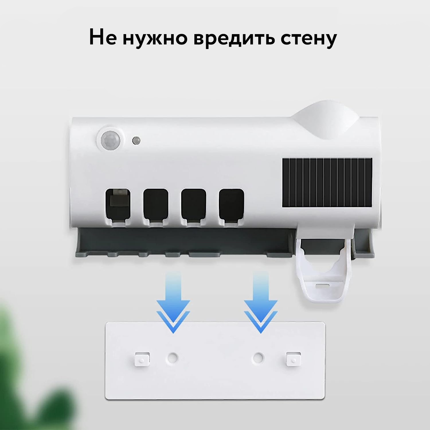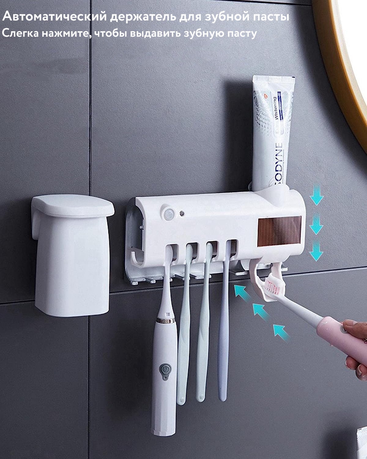 - Устройство 3в1: держатель для зубных щеток + ультрафиолетовая дезинфекция + механический дозатор зубной пасты