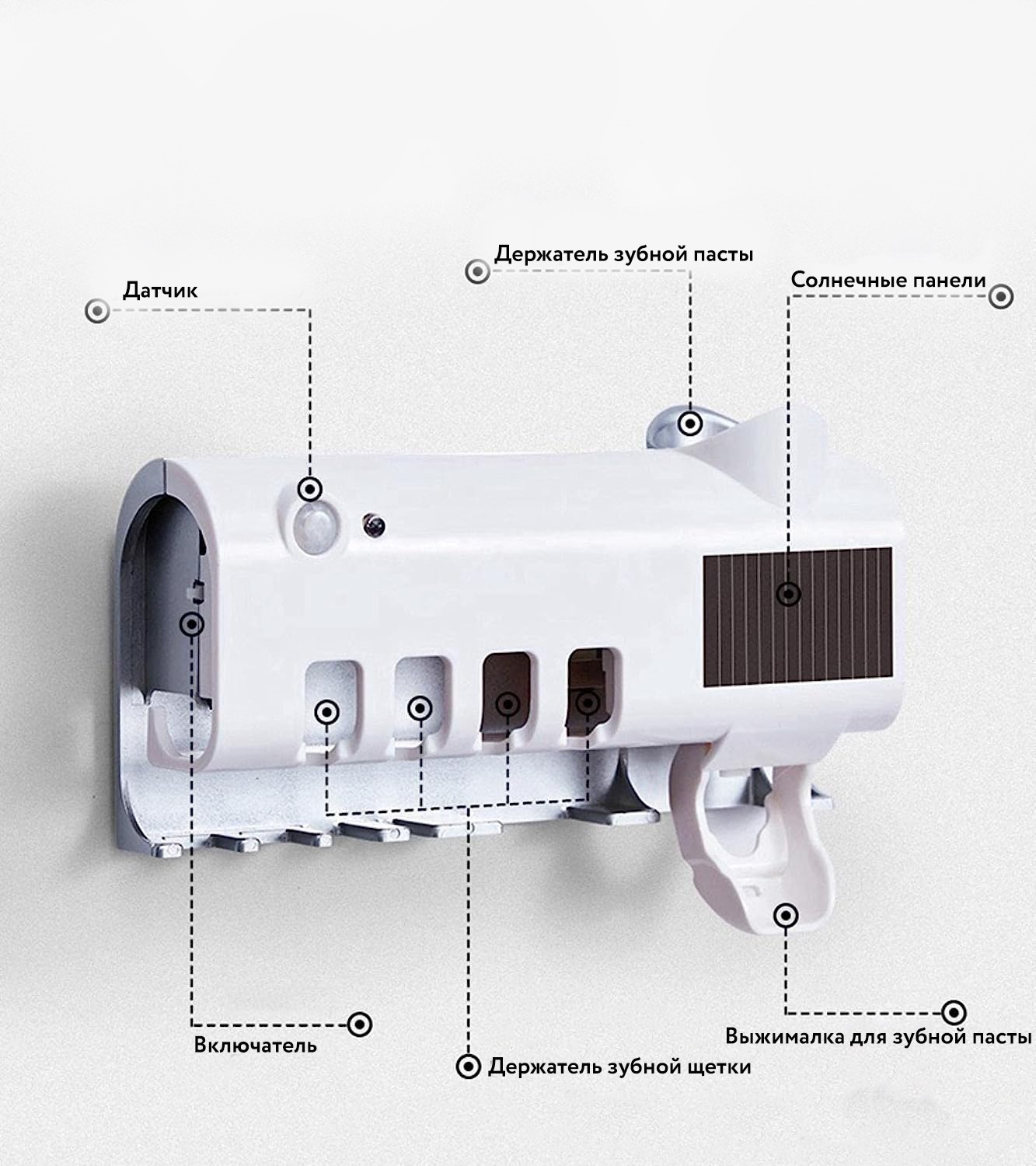 Устройство обладает сразу несколькими функциями: держатель для зубных щеток, ультрафиолетовый стерилизатор (дезинфектор) и механический дозатор зубной пасты.