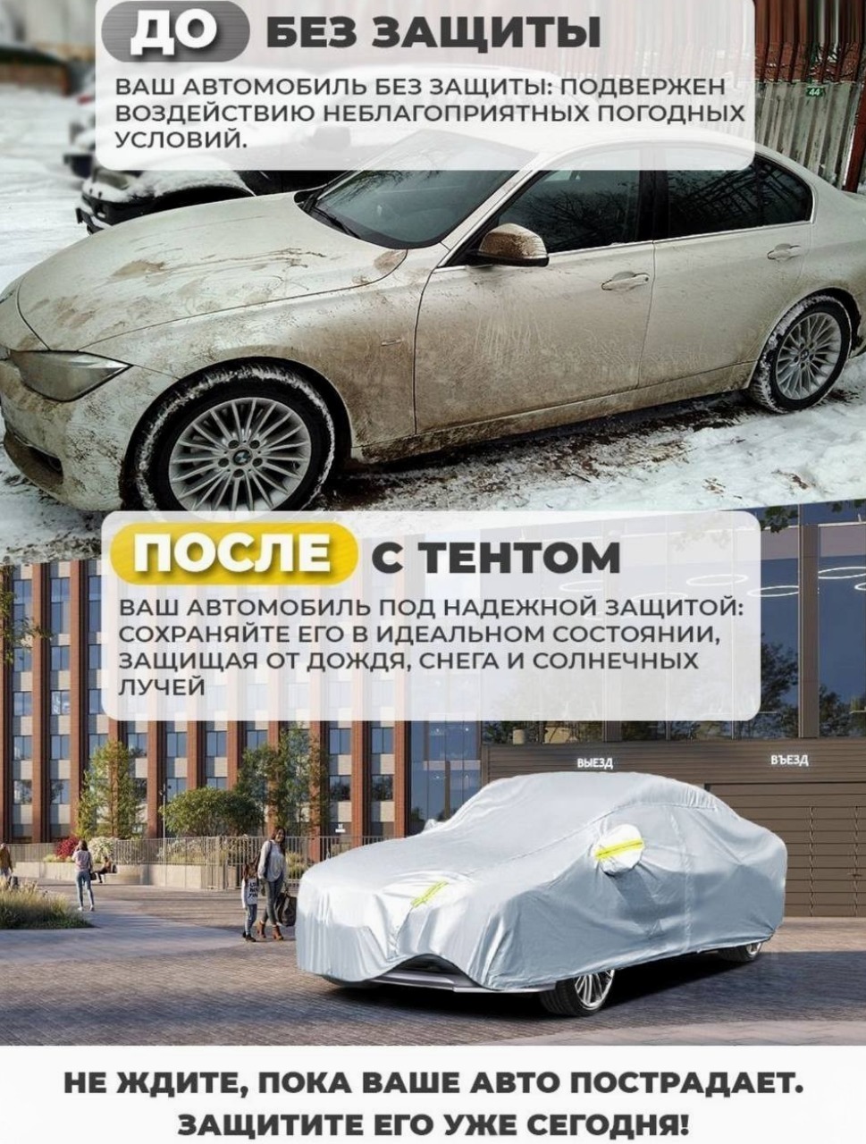 Уличная накидка от солнца защищает лакокрасочное покрытие от царапин, частых мойок и перекраски. Чехол устойчив к пыли и влаге, а если он правильно подобран по размеру, его крепления по периметру надежно удержат его на кузове автомобиля, не позволяя ветру сорвать его. Материал тента водоотталкивающий с гладкой внешней поверхностью.