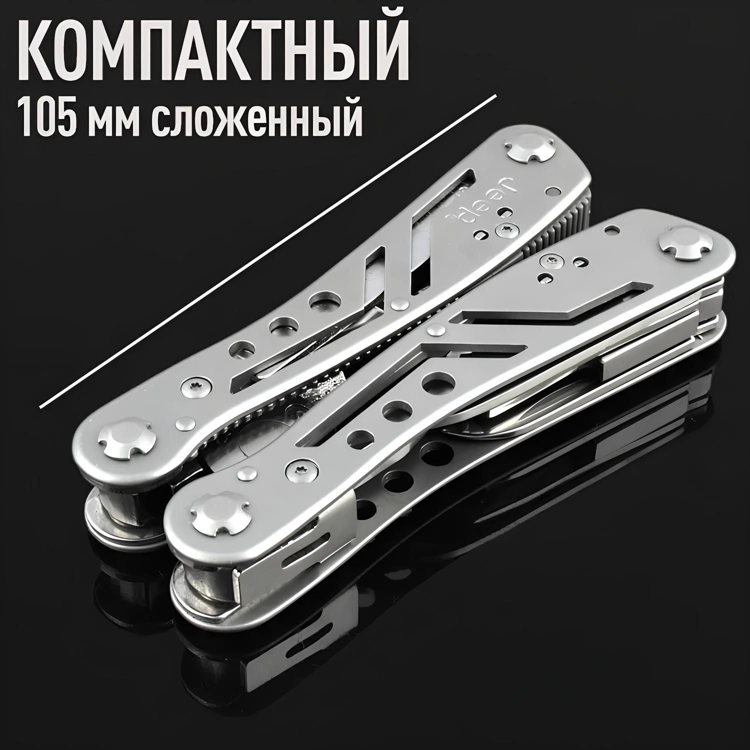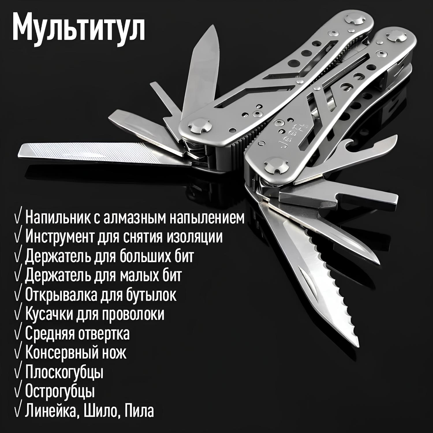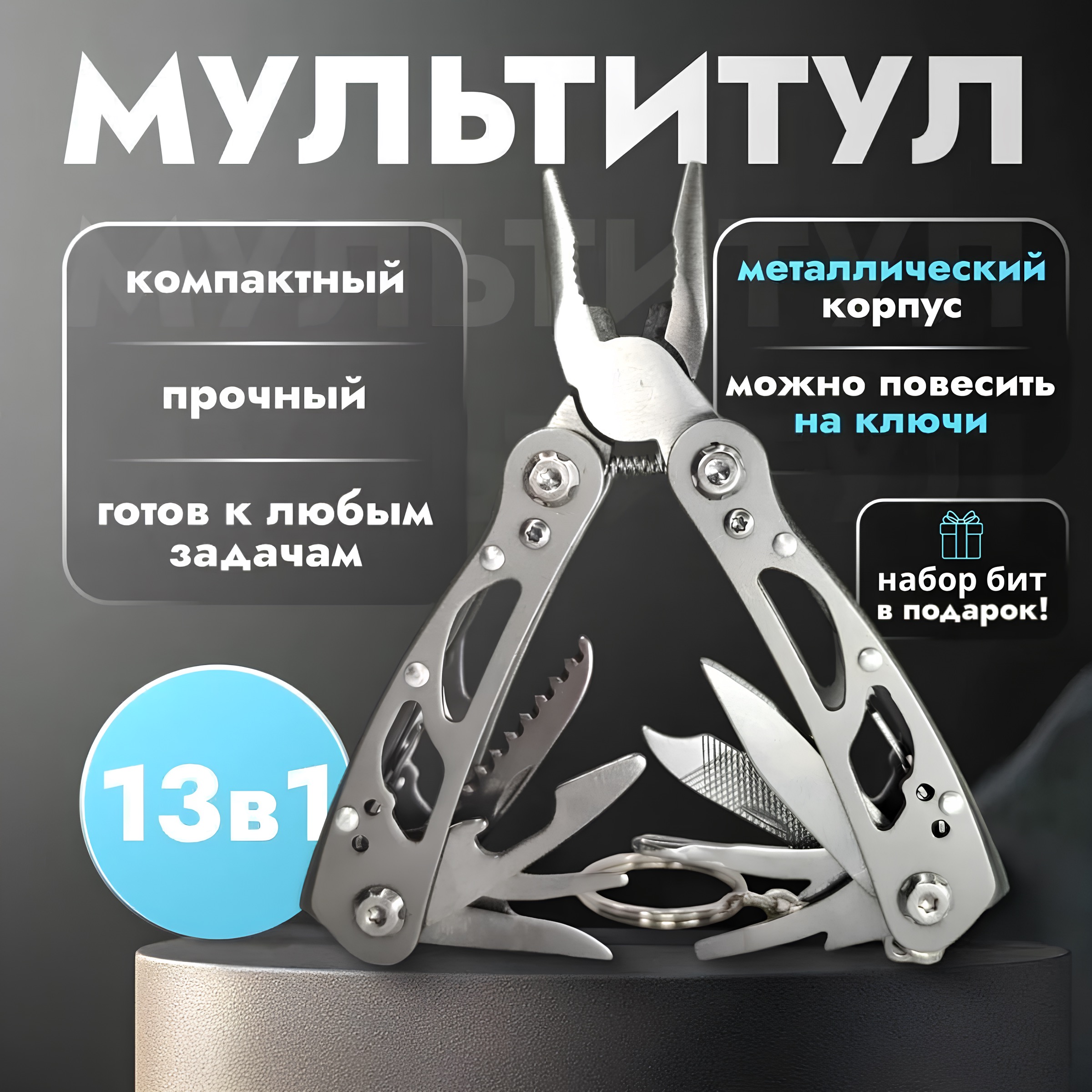 13 в 1 - Мультитул поставляется с ножом, пилой, плоскогубцами, открывалкой для бутылок, консервным ножом, отверткой, складным ножом, плоскогубцами, резаком и многим другим.