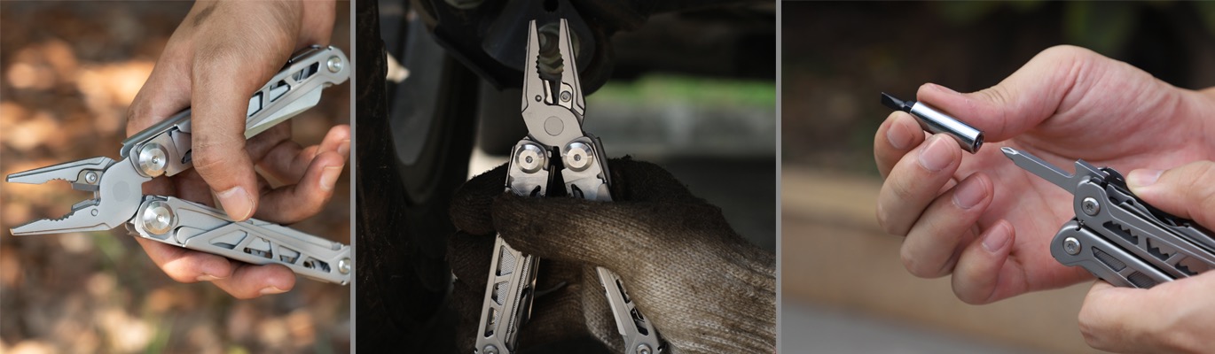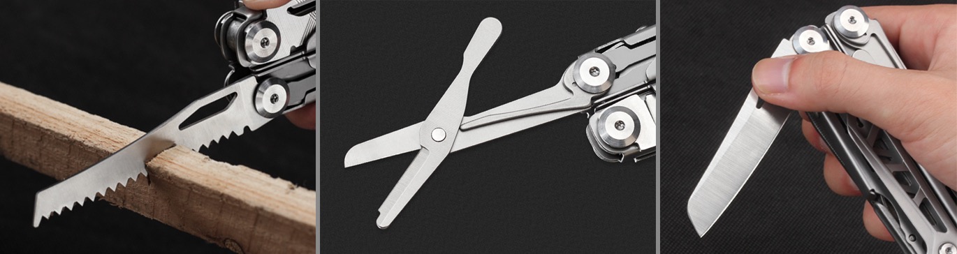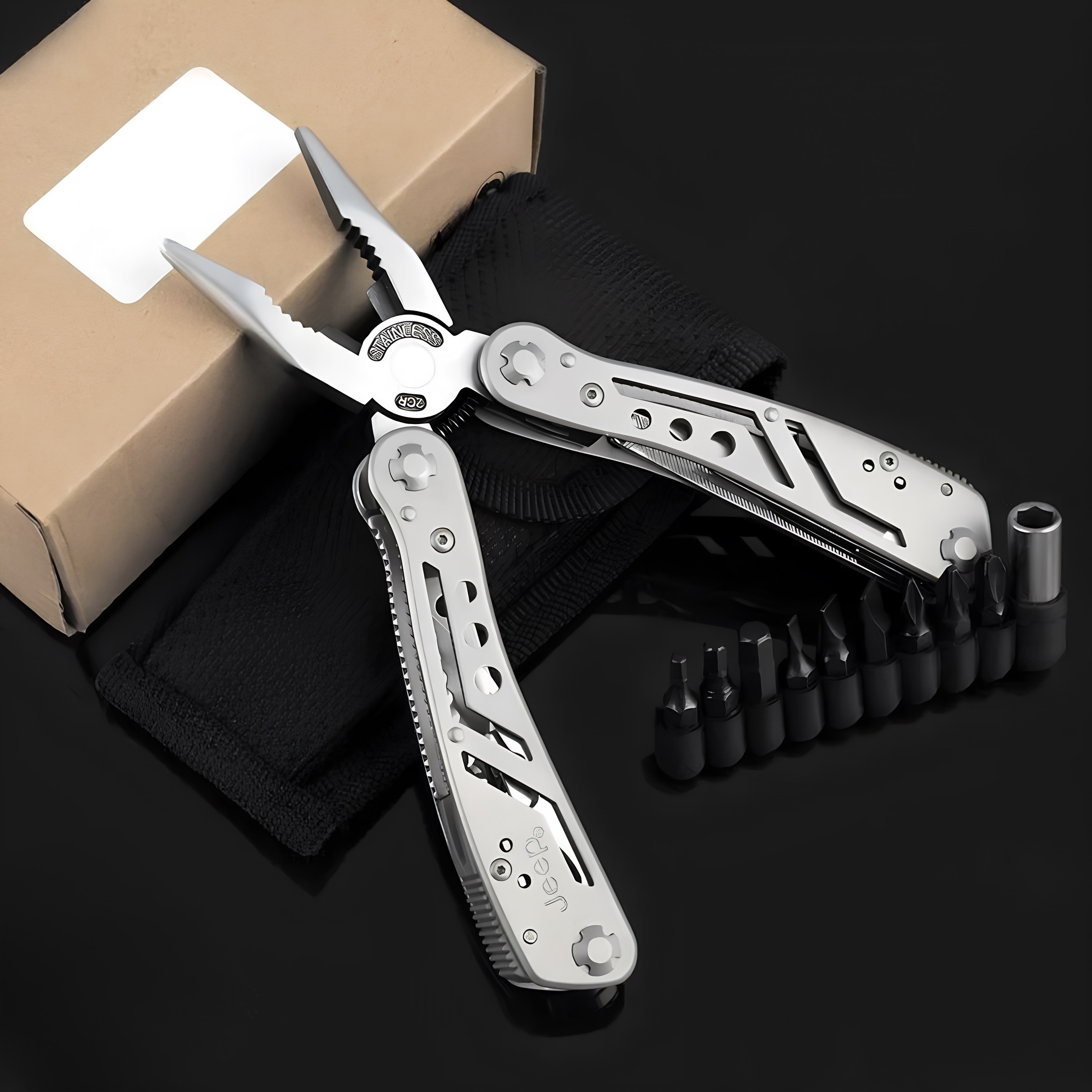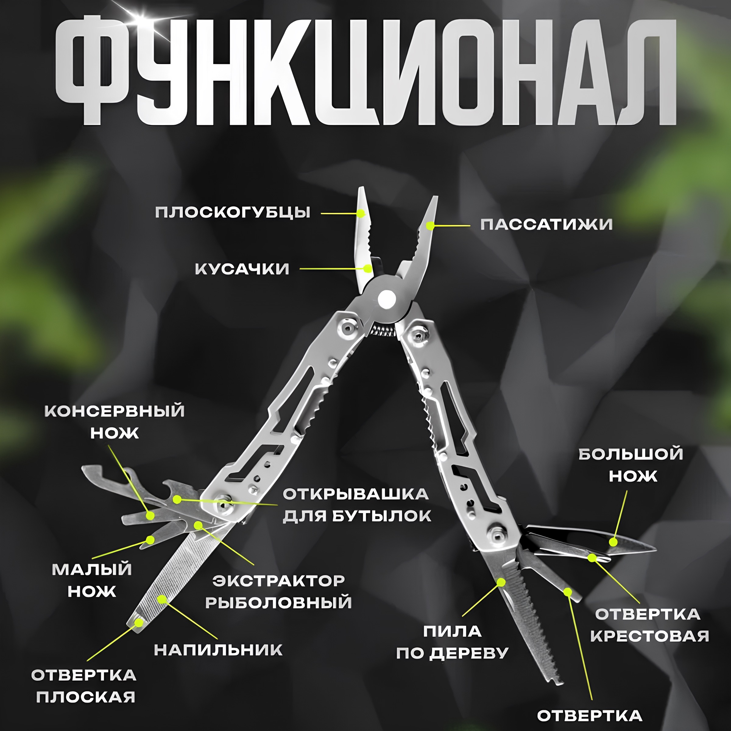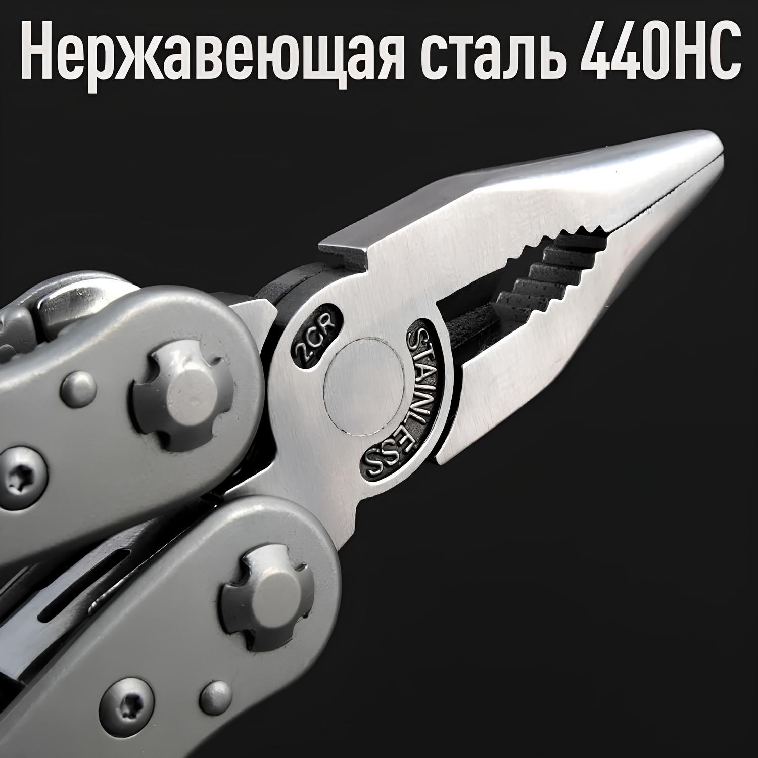 13 в 1 - Мультитул поставляется с ножом, пилой, плоскогубцами, открывалкой для бутылок, консервным ножом, отверткой, складным ножом, плоскогубцами, резаком и многим другим.