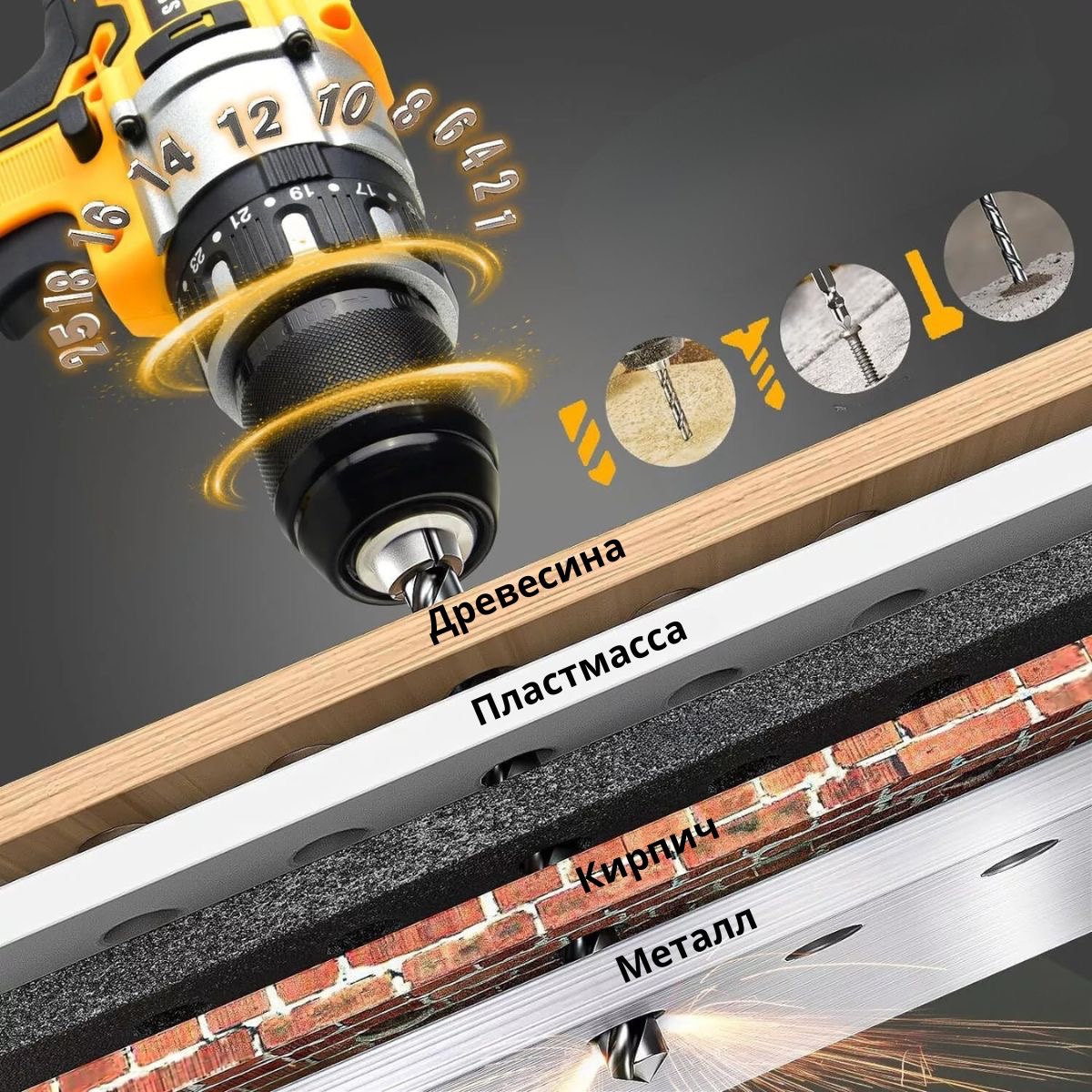 - 25-позиционный регулятор крутящего момента позволяет работать с разными материалами и шурупами.