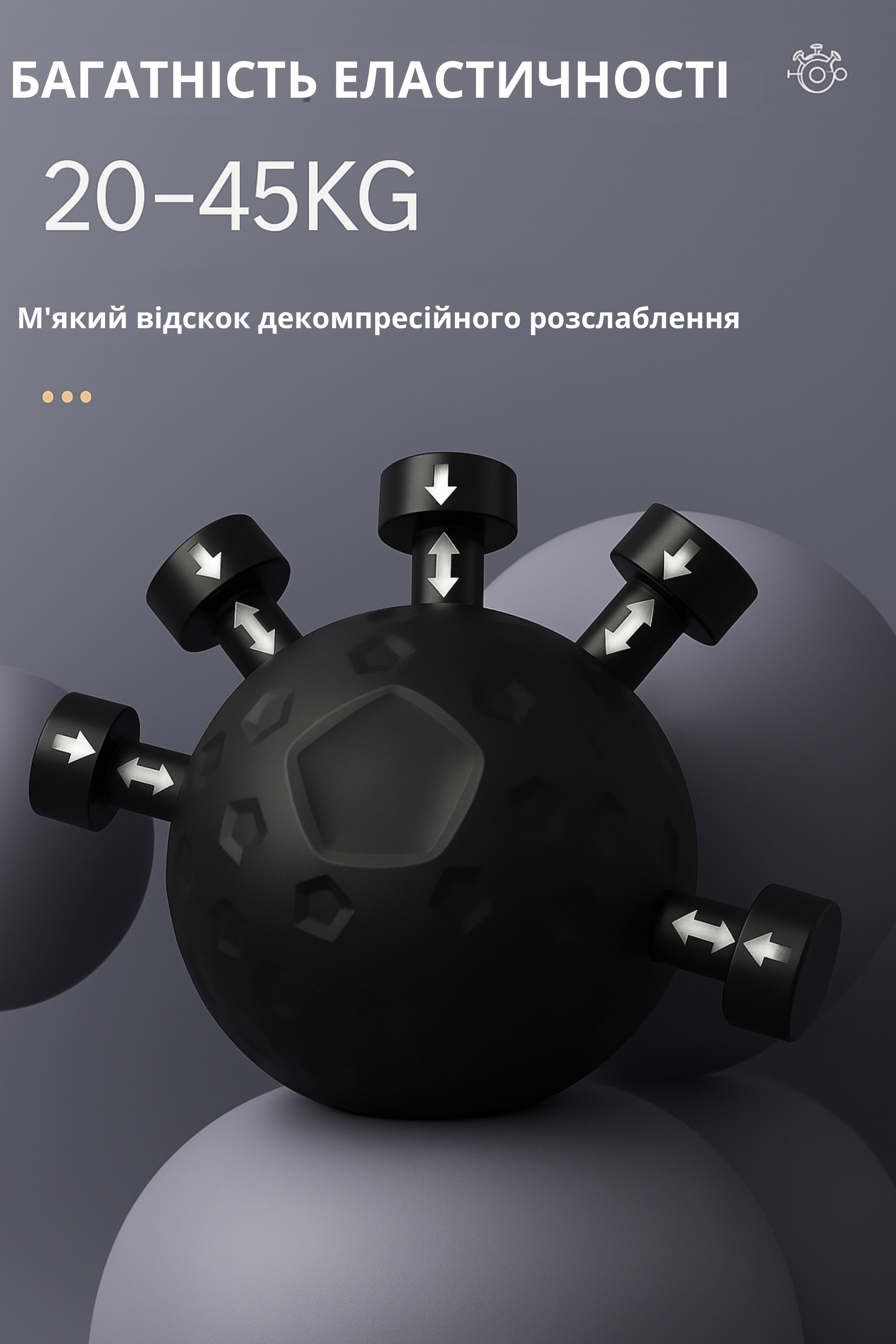 Ергономічний і компактний еспандер-м'яч для розвитку сили, витривалості та рухливості пальців, кистей і передпліч. Підходить для спортсменів, музикантів та людей, які проходять відновлення після травм. Сферична форма (12 × 9,5 × 7 см) забезпечує природне положення руки та комфорт під час тренувань.
