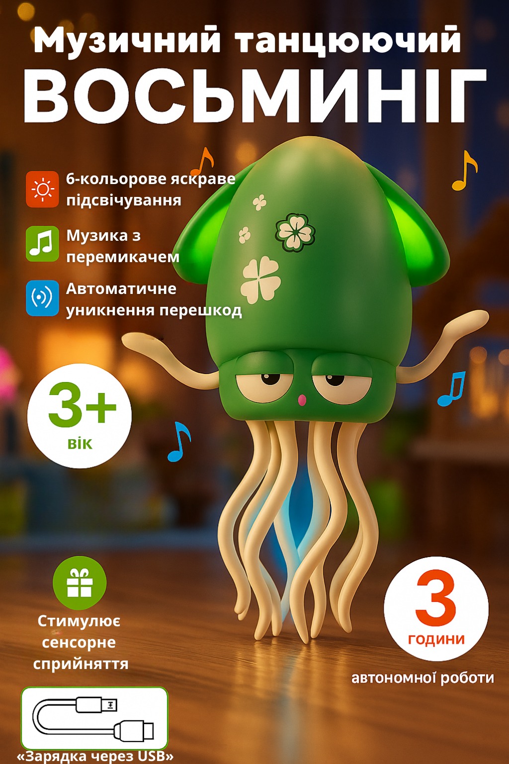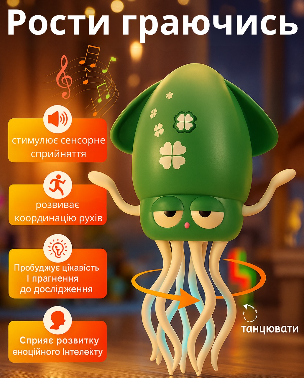Іграшка «Музичний танцюючий восьминіг» — це не просто розвага, а справжній помічник у розвитку дитини. Вона поєднує в собі навчання, яскраві емоції та безпеку, викликаючи щирий захват у малюків.
