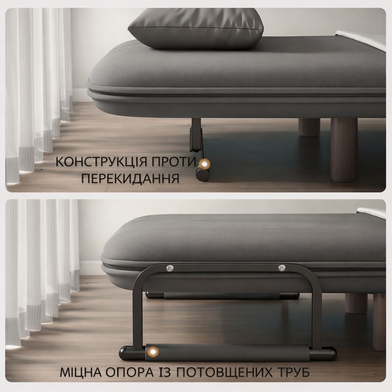У складеному вигляді виріб займає мінімум простору, тому ідеально підходить для квартири, вітальні, спальні, офісу або зони відпочинку. Регульована спинка з п’ятьма рівнями нахилу дозволяє обрати оптимальне положення — для читання, перегляду фільмів або сну.