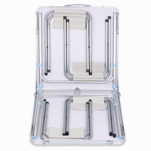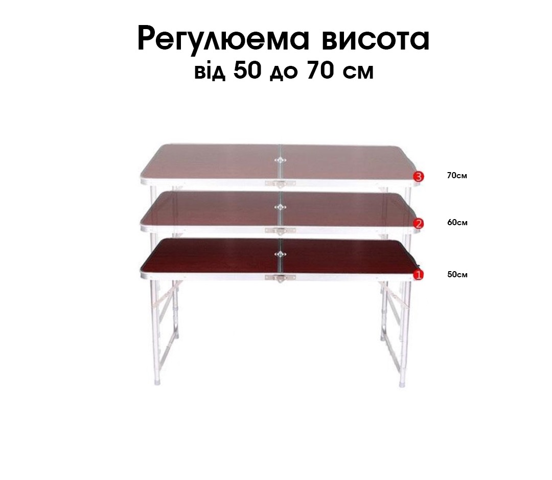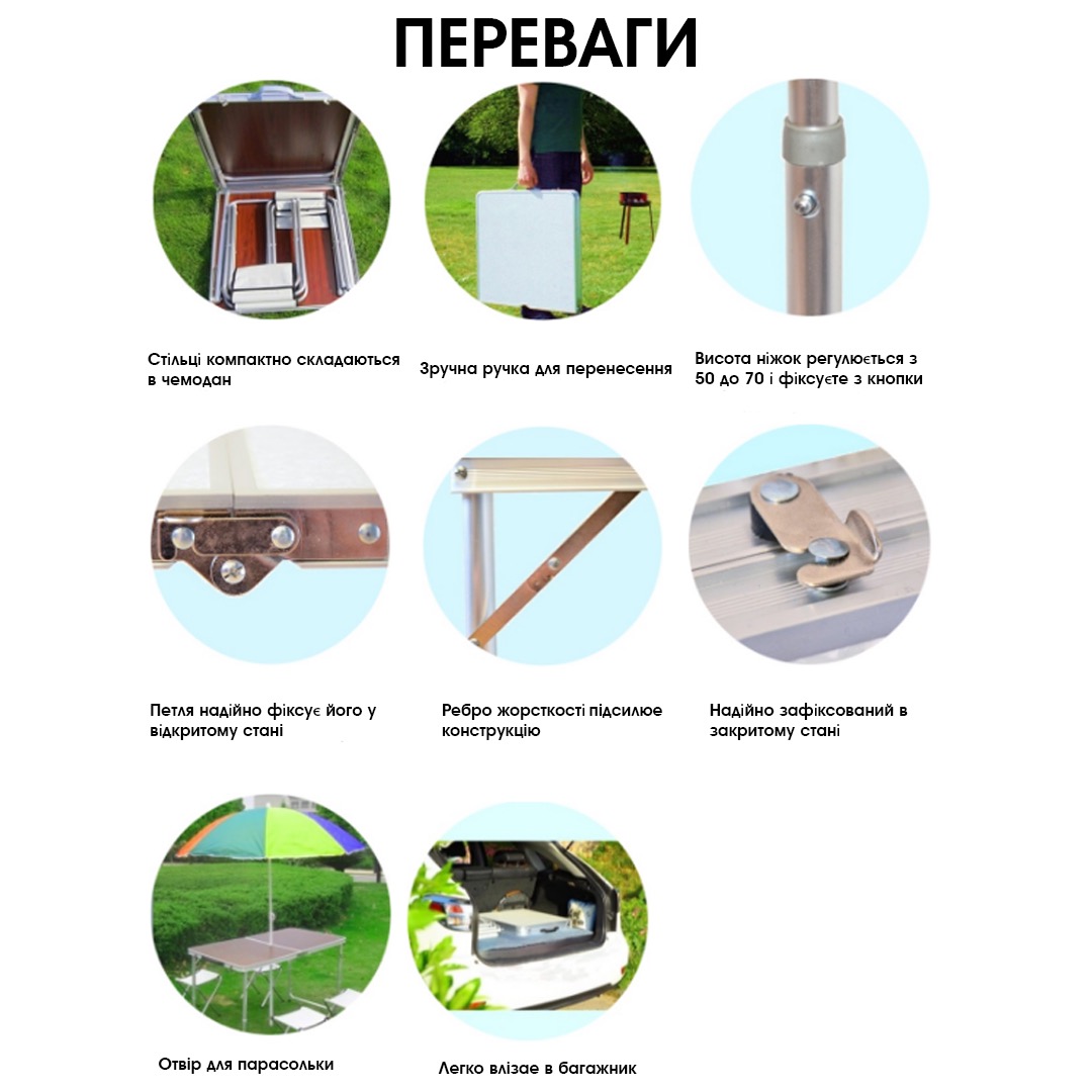 Особливістю даного розкладного столу є висувні ніжки, які фіксуються спеціальними кнопками-засувками У складеному вигляді стіл перетворюється в чемоданчик з ручкою, легкий і практичний, він не стане обтяжливим вантажем і значно полегшить Ваш відпочинок. Покриття стільниці - меламін, який володіє водовідштовхувальними властивостями і стійкий до різного роду механічних пошкоджень: подряпин, сколів і т.д. Складаний туристичний стіл зробить Ваш пікнік на природі по-домашньому комфортним, особливо якщо Ви подорожуєте на авто або купуєте стіл для дачного саду.