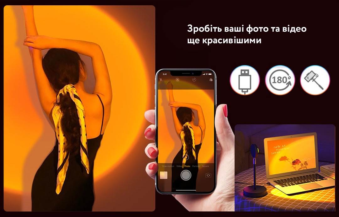 Проекційні лампи для заходу - справжня інтернет-сенсація завдяки таким мережам як TikTok і Instagram. Багато блогерів почали використовувати проекційні лампи, щоб робити Селфі і фото, і вони виходять дуже яскравими і соковитими. Погодьтеся, адже зробити ідеальне Селфі на заході на камеру мобільного телефону досить таки складно. Що ж, секрет нарешті розкритий. Цей трюк зі світловим світлом можна зробити не сидячи біля вікна, а з унікальною проекційної лампою, яка імітує захід.
