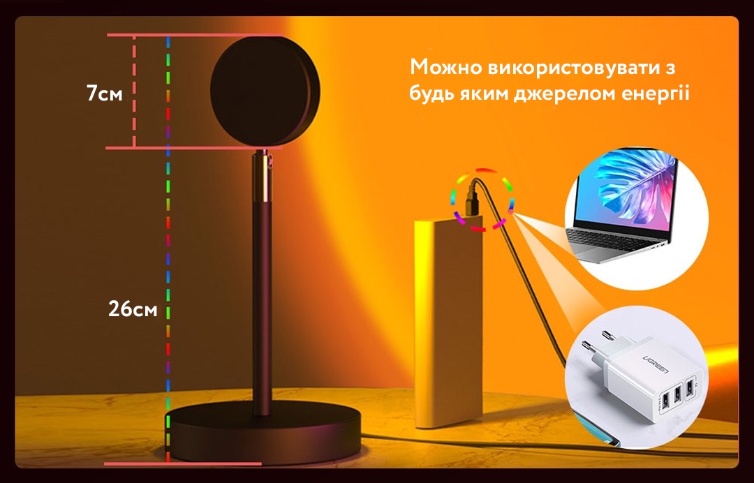 Якщо ви бажаєте створити в своєму будинку теплу сучасну атмосферу, проекційна лампа для заходу - прекрасне рішення для освітлення. Або ж хочете внести сонячне світло в кімнату, в якій мало світла, найкращим рішенням буде проекційна лампа для заходу. Настільний світильник з проекцією заката- це райдужний сучасний світлодіодний світильник який також можна використовувати для вітальні, для спальні, як проектор, торшер, реквізит для фотосесій.