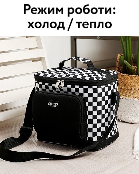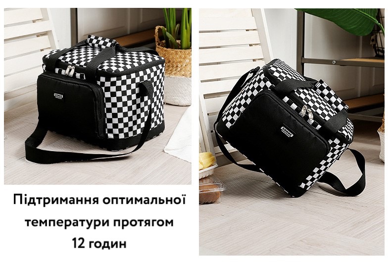 Вага 400 г Висота 30 см Ширіна 21 см Довжина 21 см Підтримка температури за допомогою акумуляторів. холоду 12 годин Кишеньки для аксесуарів Є Матеріал 600 D поліестер Підкладка Алюмінієвий термопласт Принт Шаховий Режим роботи Холод/тепло