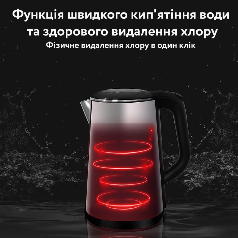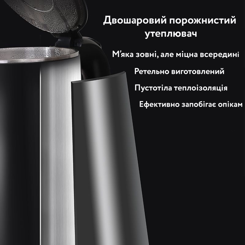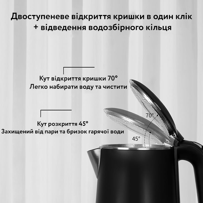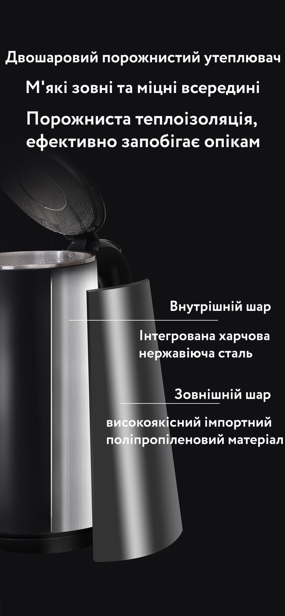 Передбачено унікальну функцію підтримки вибраної температури протягом 30 хвилин. Прихований нагрівальний елемент гарантує безпеку та тривалий термін експлуатації пристрою. З прозорою шкалою наповнення легко контролювати кількість води, економити час та електроенергію. Бездротова база обертається на 360° і має стійкі ніжки, що запобігають ковзанню.