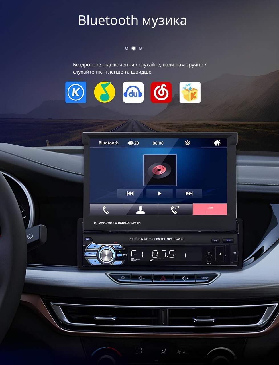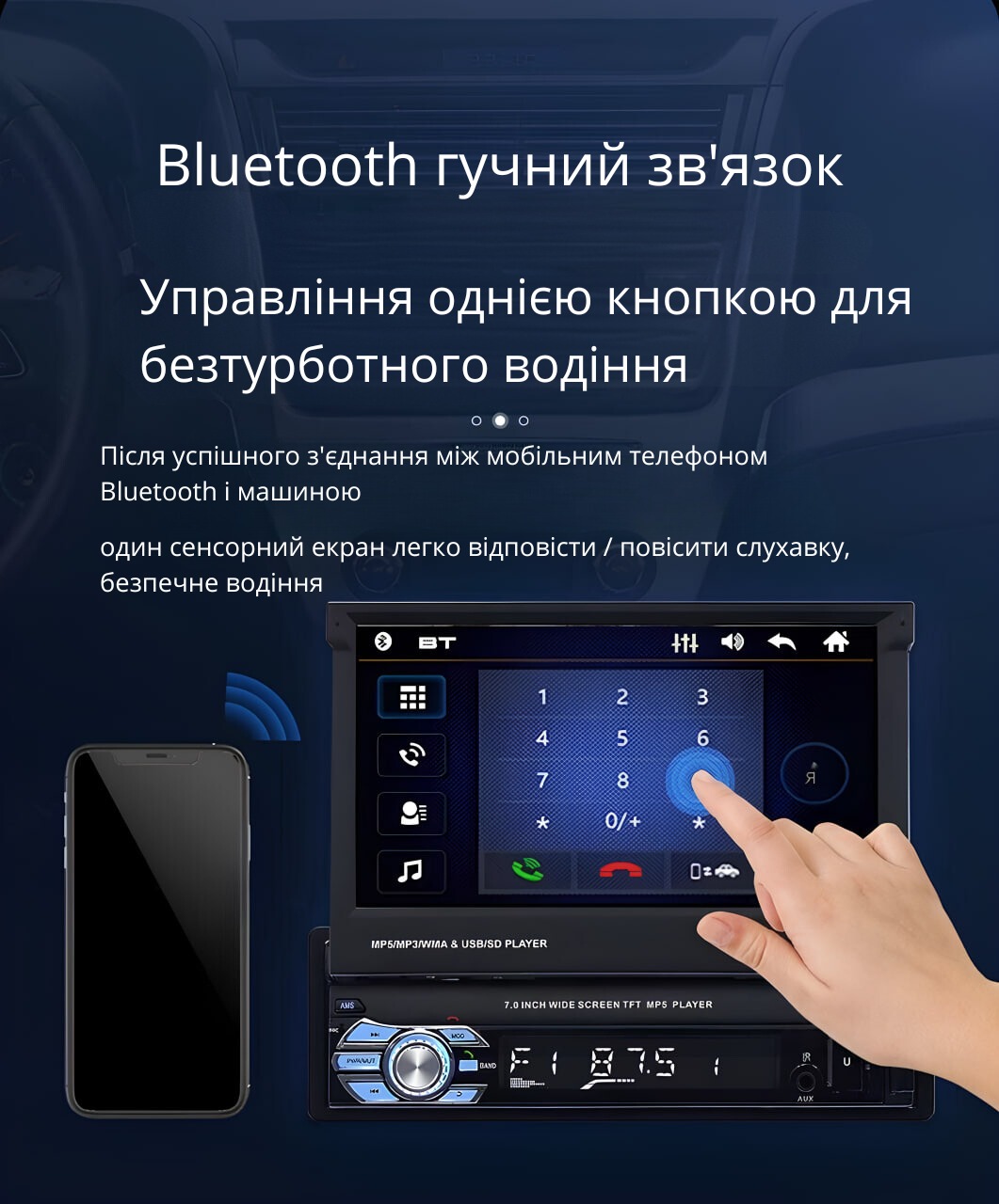 Японська Bluetooth магнітола 1-din в авто з виїзним екраном