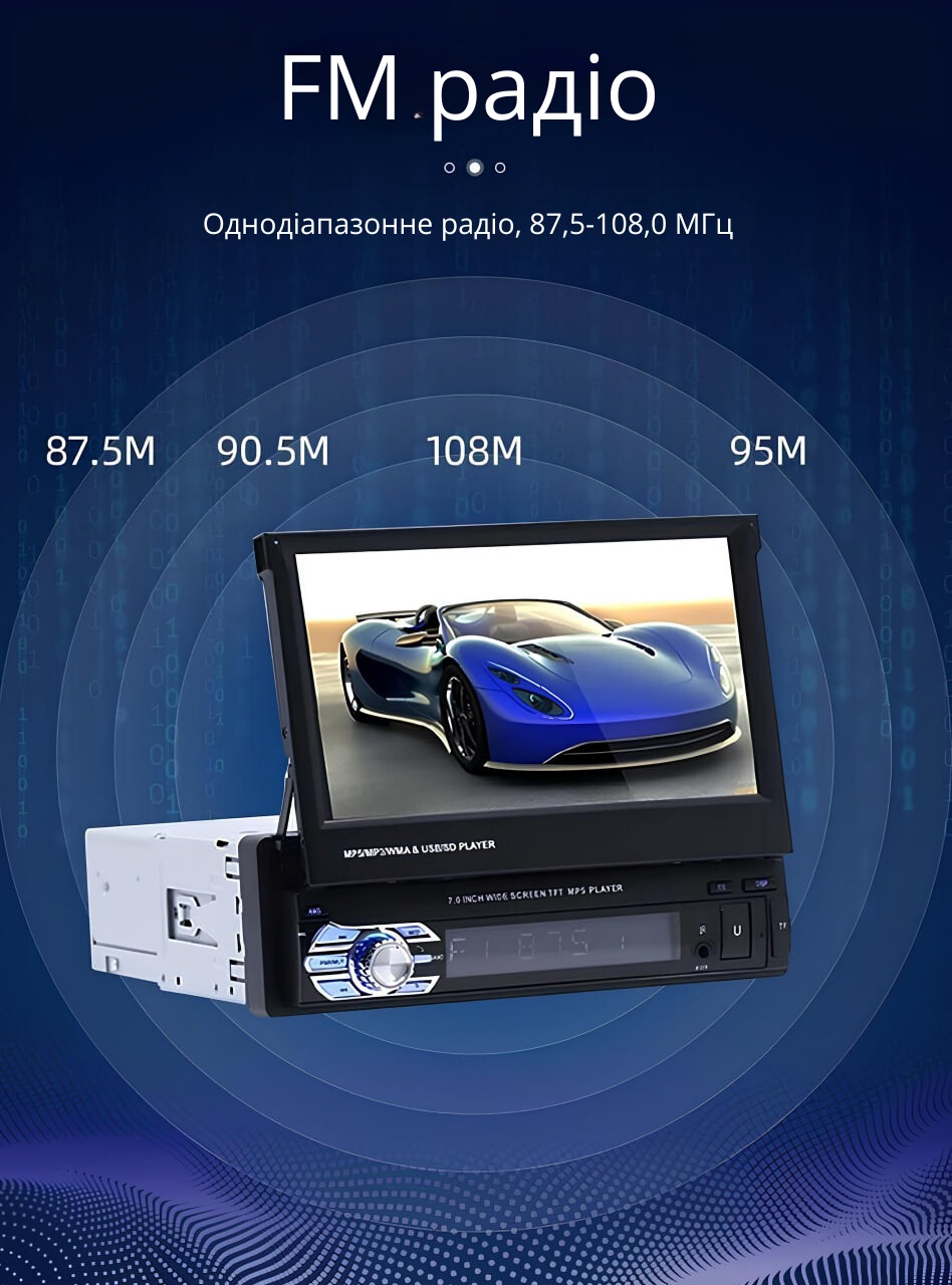 Автомагнітола 9601CM – це практична 1DIN модель з моторизованим 7-дюймовим сенсорним екраном (розширення 800x480). Вона включає FM-тюнер та аудіо/відео виходи (RCA) для підключення додаткових пристроїв. Вбудований USB-інтерфейс і підтримка карт пам'яті microSD забезпечують зручне відтворення музики та відео з зовнішніх носіїв.
