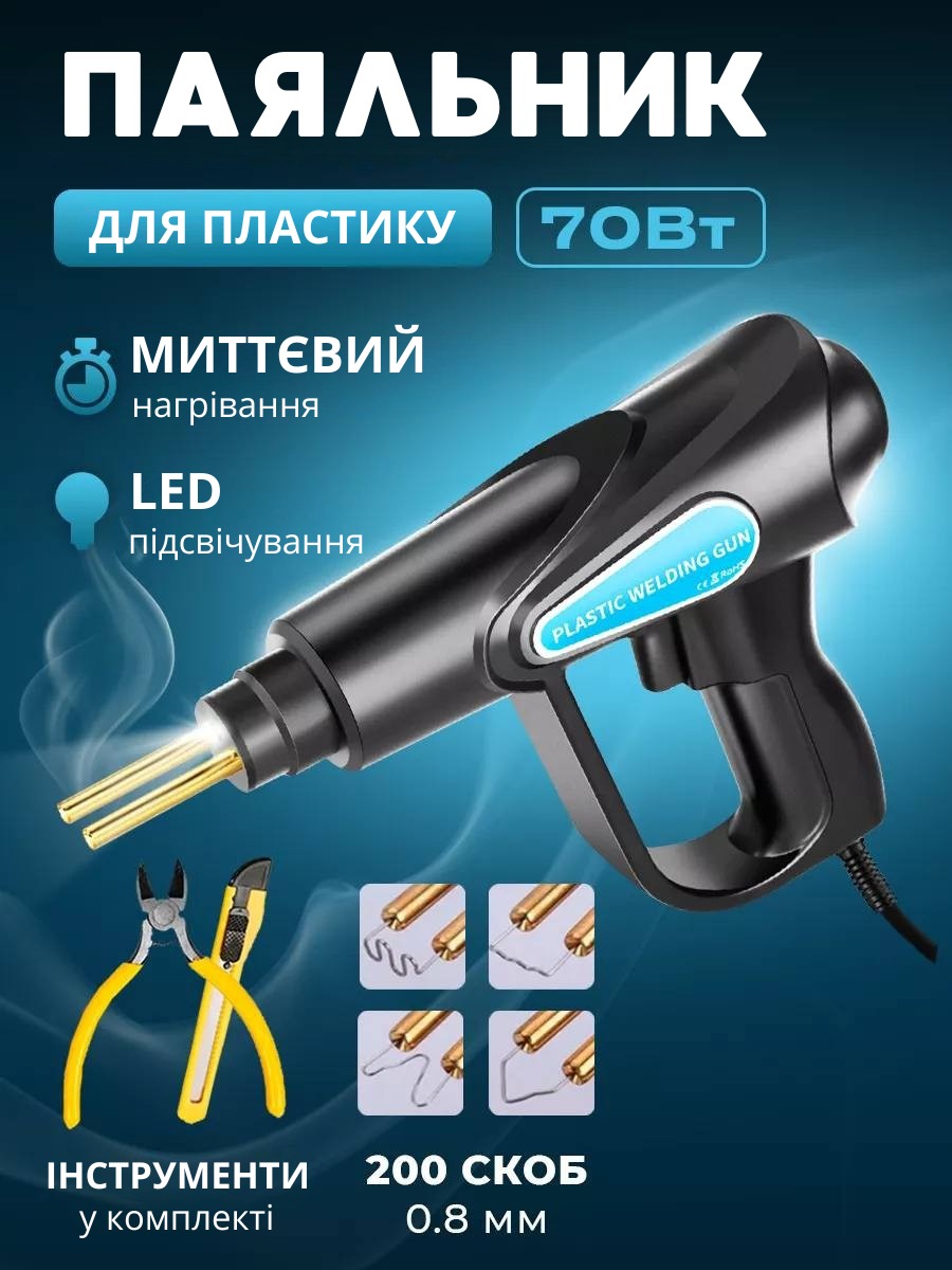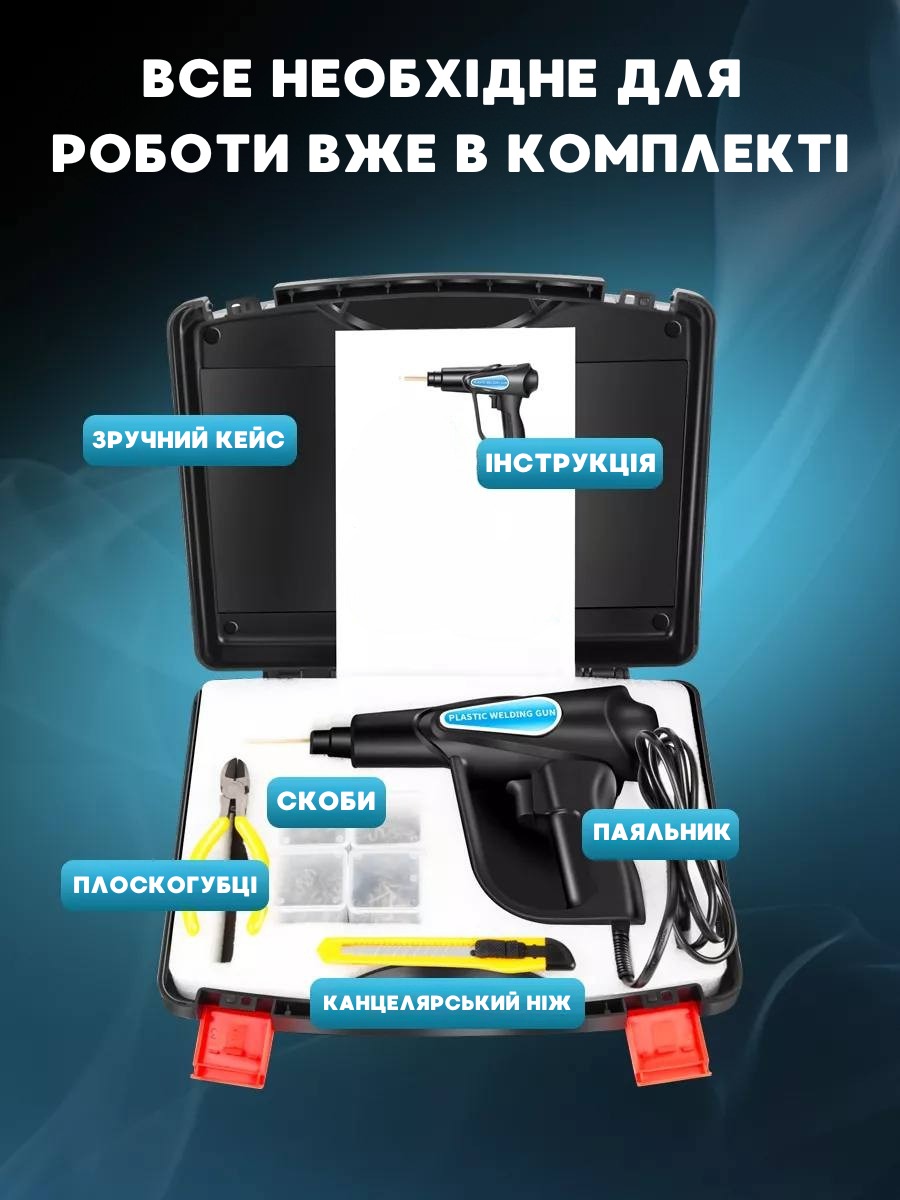 - ЕКОНОМІЧНІСТЬ: Термостеплер для пластику - це пристрій, який легко використовувати. Немає необхідності мати спеціальні знання або досвід роботи з пластиком. Достатньо під'єднати пристрій до електричної мережі, дати йому прогрітися і почати роботу.