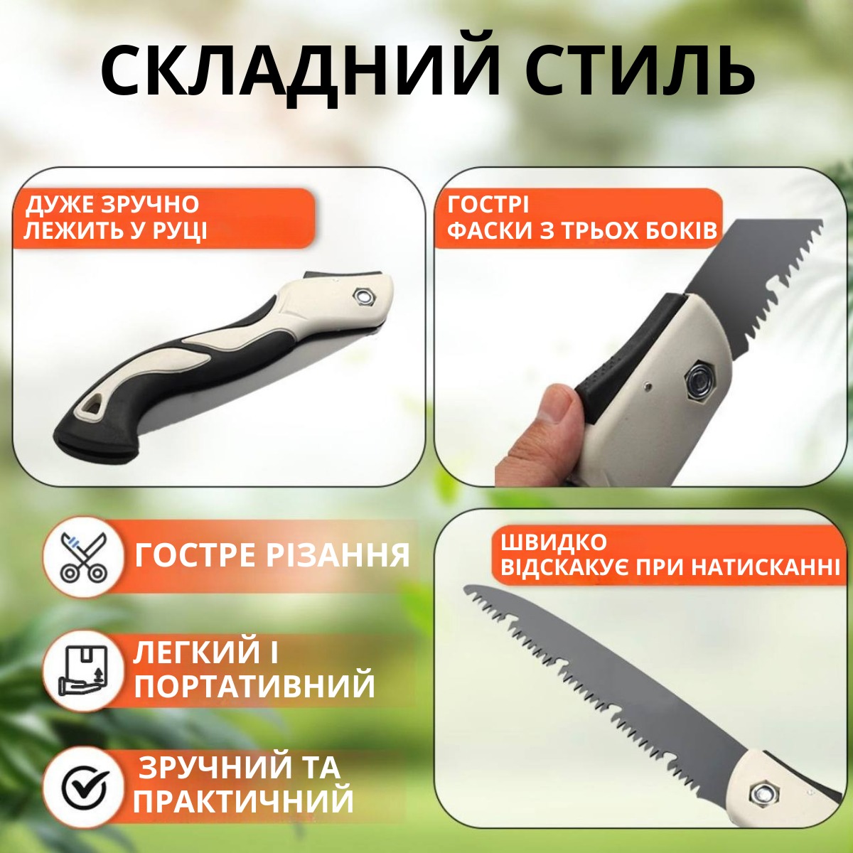 Складна садова пилка, також виготовлена з японської сталі, має гостре полотно і легко справляється з обрізкою товстих гілок та сучків. Компактний дизайн та можливість складання роблять її зручною для зберігання та транспортування.