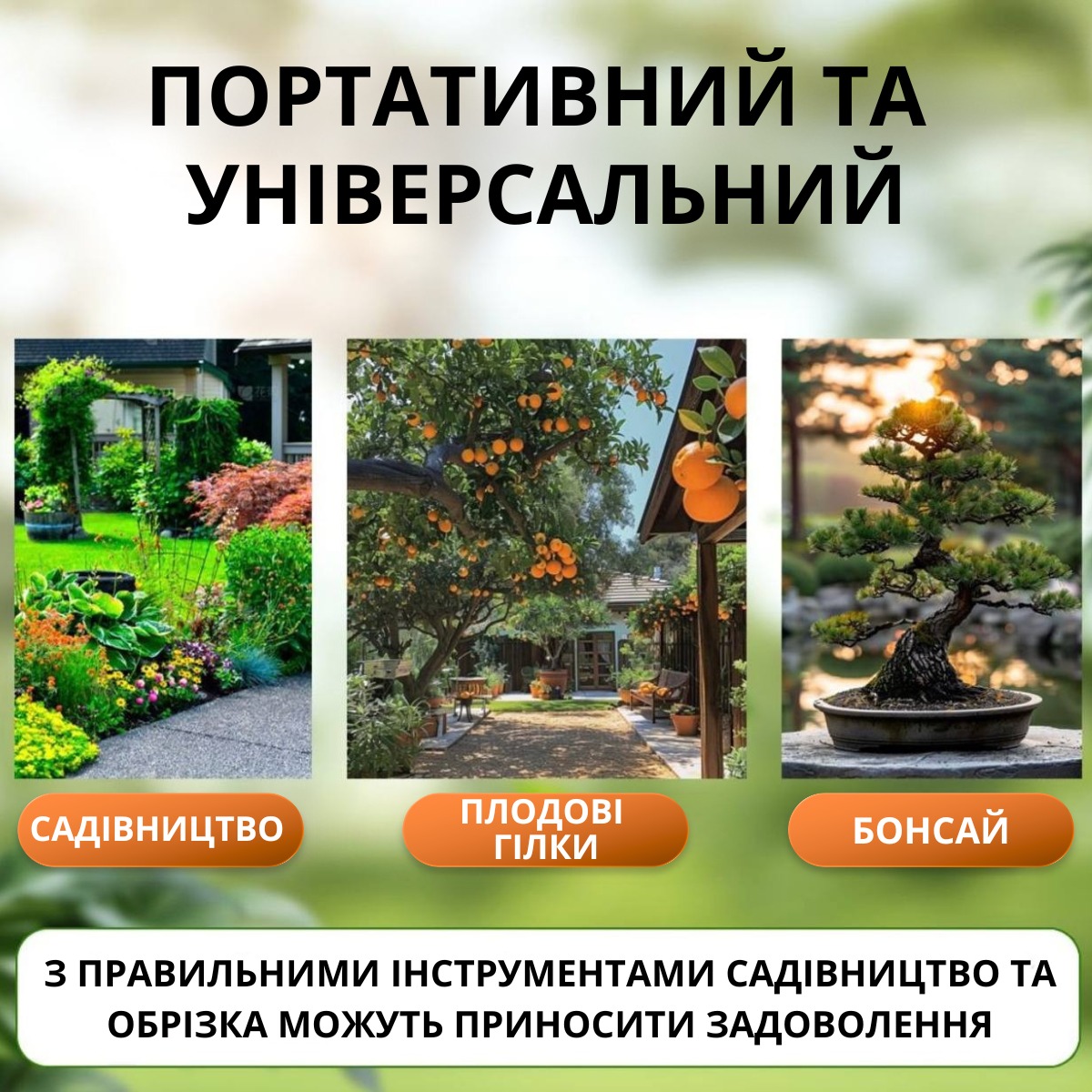 З цим набором ви зможете обрізати гілки, стригти кущі, пиляти невеликі дерева та сучки, підрізати квіти та створювати букети. Набір інструментів дозволяє виконувати широкий спектр садових робіт.